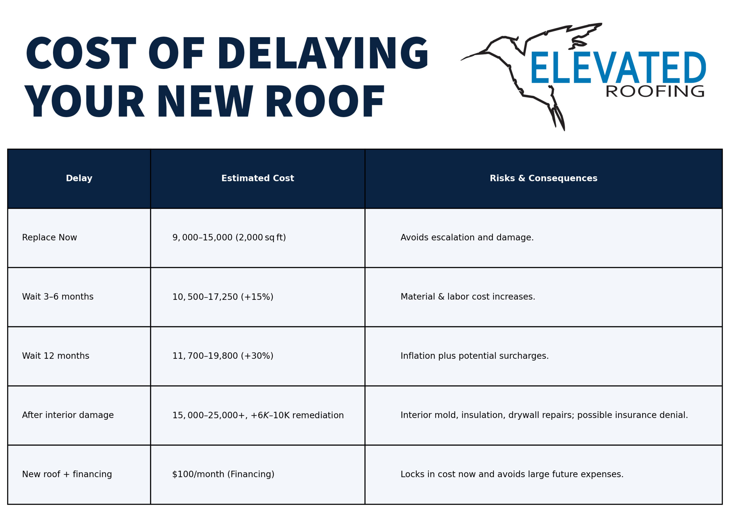 Delaying a roof replacement can lead to higher costs over time. Below is a clear comparison of estimated expenses depending on how long you wait to replace your roof: